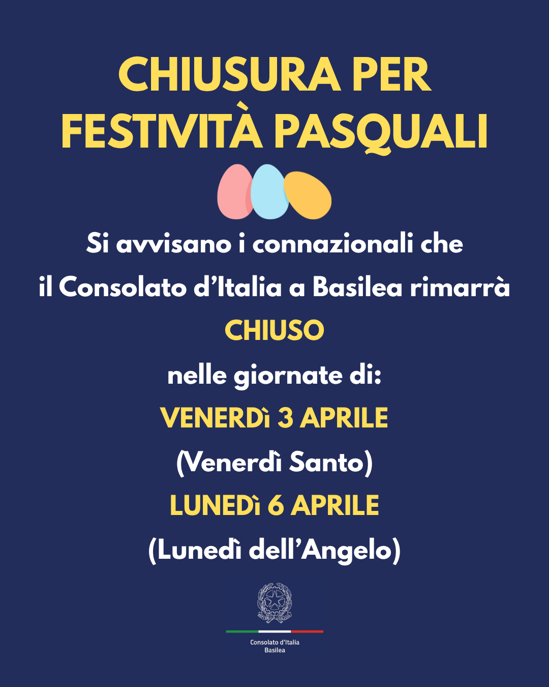 Si avvisano i gentili connazionali che questo Consolato rimarrà chiuso nelle giornate di venerdì 3 e lunedì 6 aprile, in occasione delle festività pasquali.